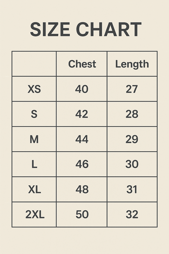 Answer 1: The T-shirt is available in six sizes: XS, S, M, L, XL, and 2XL. The size guide provides chest measurements ranging from 40 to 50 inches, with lengths varying from 27 to 32 inches. Please note that sizes may vary by +/- 0.5 inches.